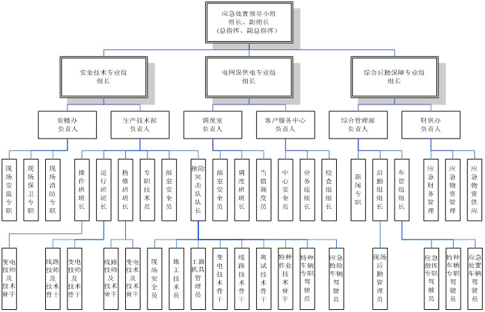 成员:综合管理部、生产技术部、调度室、客户服务中心、安稽办、财供办、抢修班、运行班、供电所、车管组、后勤组、配电分公司等主要负责人。